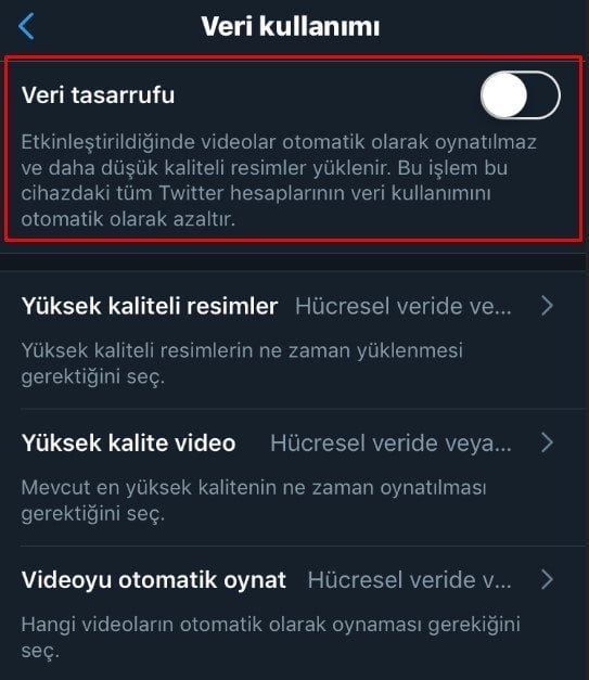 Twitter uygulamasının veri kullanımını sınırlandırmak için, genel olarak aynı “Veri kullanımı” menüsünden “Veri tasarrufu” seçeneğini aktif edebilirsiniz. Bu, otomatik oynatılan videoları devre dışı bırakır ve görselleri daha düşük kalitede görüntüler.
