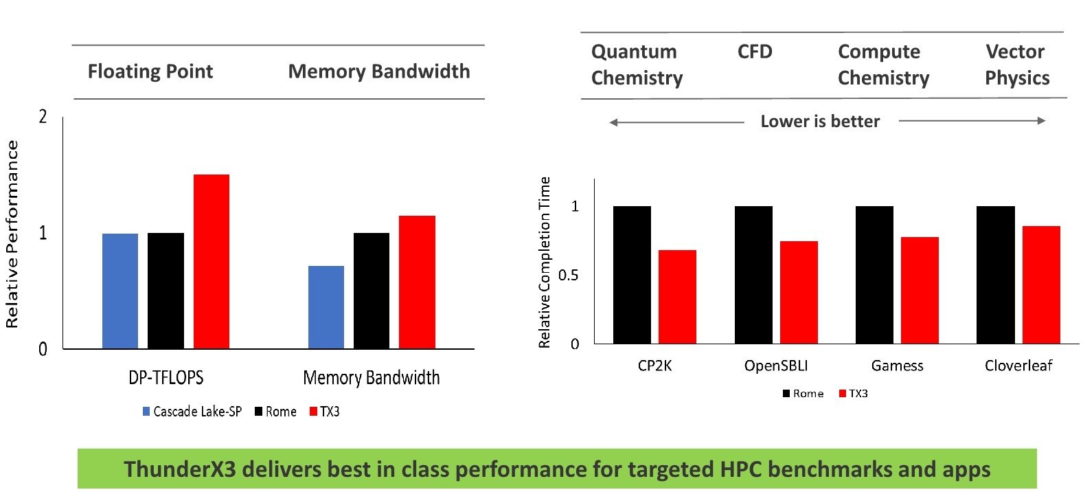ThunderX3’ün artan SIMD üniteleri ve sistemin genel güç verimliliği sayesinde güçlü yönlerini gösterebileceği söyleniyor ve bu tür hesaplamalarda önemli ölçüde daha yüksek performans sağladığı belirtiliyor. Bellek bant genişliği de AMD Roma tabanlı bir sisteme göre daha yüksek ve TX3 daha düşük gecikmeler elde edebiliyor.