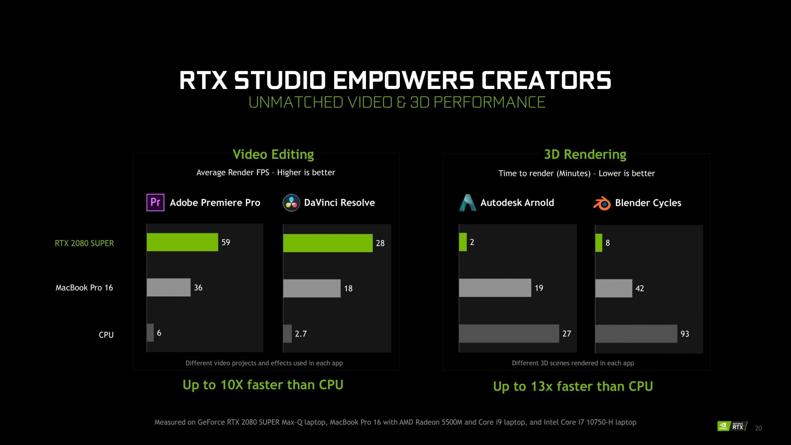 NVIDIA, video düzenlemede ve 3D Render işlemlerinde artık doğrudan MacBook’u rakip alıyor. RTX 2080 SUPER GPU’lu bir laptop, MacBook Pro 16’yı geride bırakıyor.
