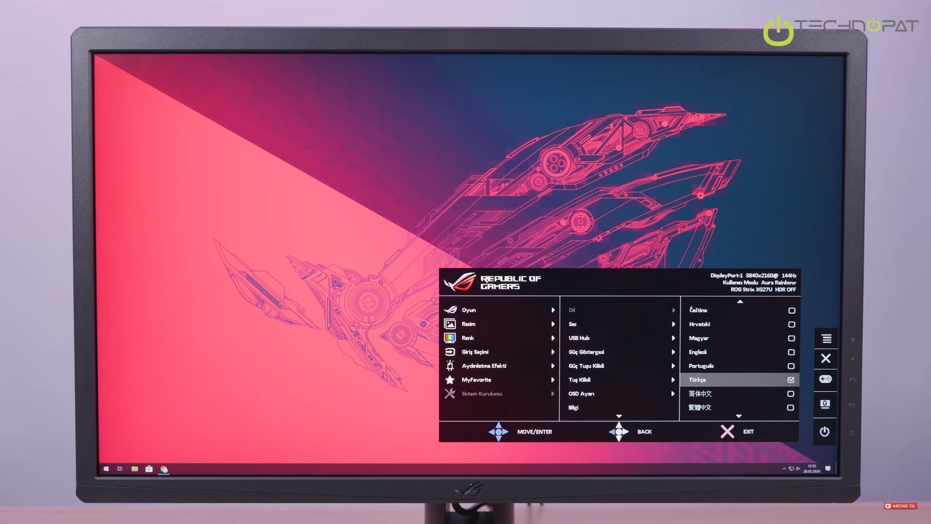 Bu modeldeki dev RGB aydınlatmalı ROG logosu, diğer ASUS ürünleriyle eş aydınlatma sunmak üzere Aura Sync üzerinden kontrol edilebiliyor. Bu arada Armoury Crate ile uygulamaların güncellendiğini ve paketlendiğini hatırlatalım. Ancak biz denediğimiz sırada monitörü Armoury Crate altında göremedik. Bunun da güncellenmesi gerekiyor.