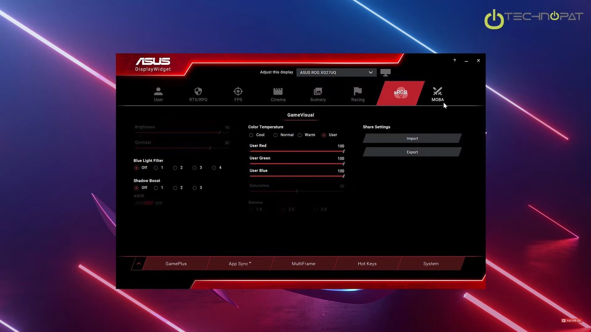 ASUS DisplayWidget Software ise monitör ayarlarını Windows altından yapmanızı sağlayan yararlı bir uygulama. Bütün monitör bağlantılarını, USB dahil yaptığınızda, monitör üzerindeki ufak joystick olmadan da ayar yapabiliyorsunuz. Yarış, strateji, FPS, kullanıcı ayarlı mod, sinema, sRGB ve MOBA gibi farklı ön tanımlı ayarlar var.