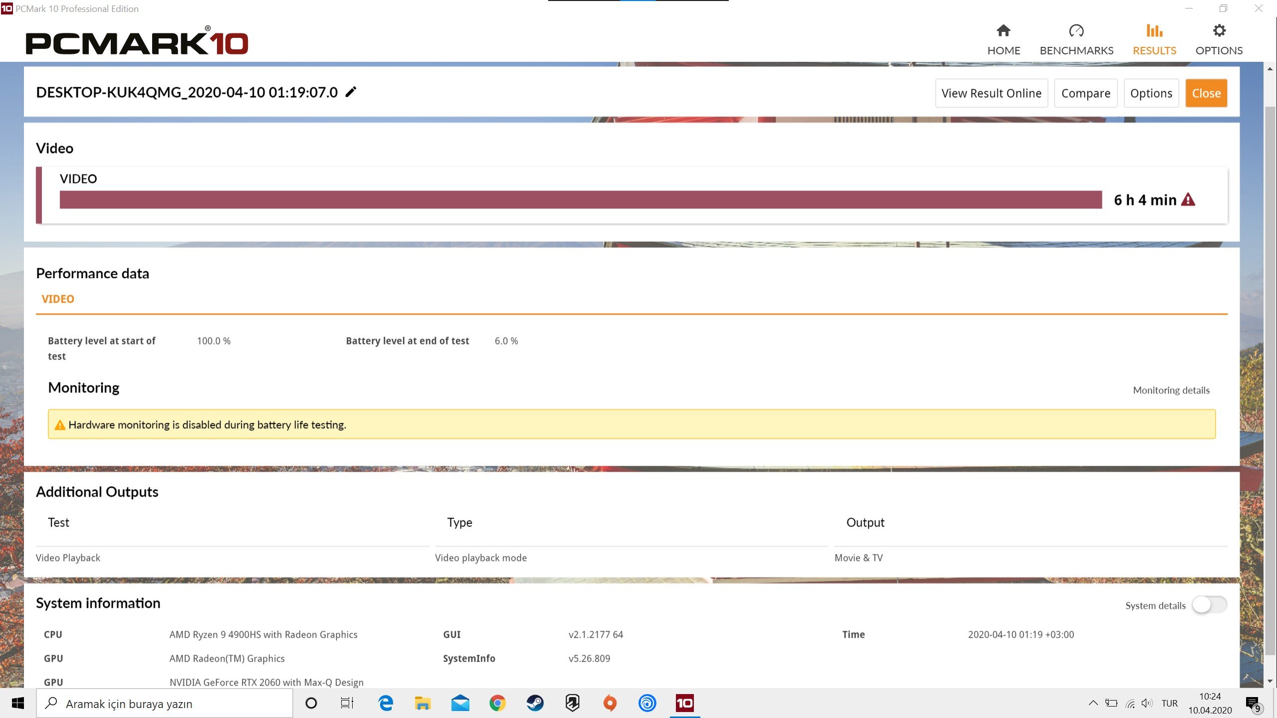Bu boyuttaki bir cihaza koyabileceğiniz batarya da doğal olarak kısıtlı. ASUS cihaza 76 Ws’lik bir batarya yerleştirmiş. UL Benchmarks’ın PCMark 10 yazılımı ile cihazın video oynatmadaki pil ömrünü test ettik ve sonuç olarak 6 saate ulaşmayı başardık. Burada AMD’nin 7nm işlemcisinin düşük güç tüketimi de büyük rol oynuyor. PCMark 10 güncellendiğinde şu anda hatalı olan diğer modüllerle de cihazları daha kapsamlı testlere tabi tutacağız.
