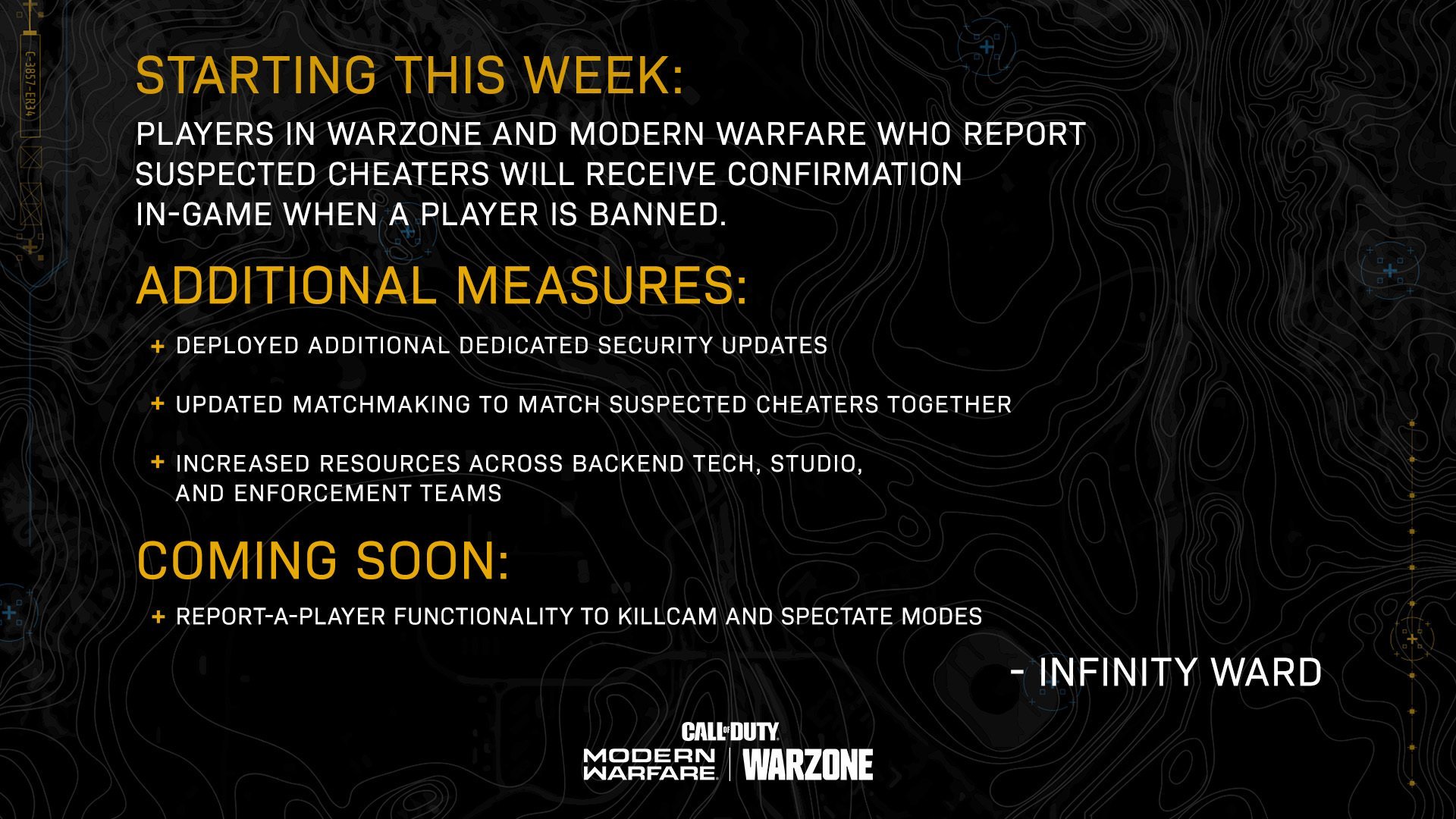 Yayınlanan rapora göre Activision son güncellemesiyle beraber yeni bir güvenlik sistemini kullanıma sunacak. Bu sistem sayesinde oyuncular hile yaptığından şüphelendiği oyuncuları kolay bir şekilde yapımcı firmaya raporlayabilecek. Söz konusu bu oyuncular ise soruşturma sürecinde birbirleriyle eşleştirilecek. Soruşturma sonunda ise hile yaptığı ortaya çıkan oyuncular ise oyundan kalıcı olarak banlanacak ve rapor eden kişiye oyuncunun banlandığı bildirilecek. Böylelikle oyundaki diğer oyuncularda hilecilerden haberdar olabilecek.