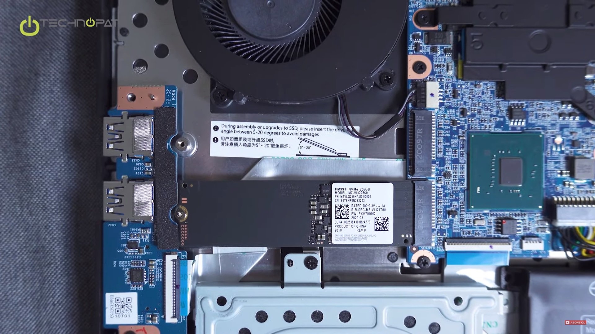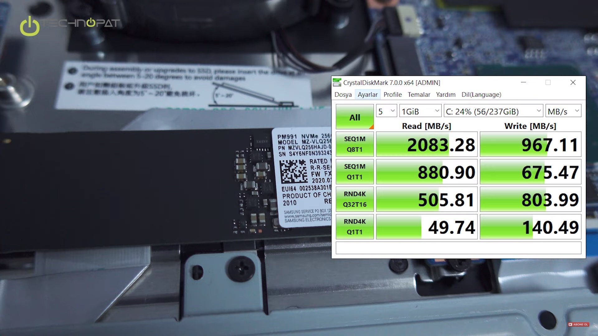 Bize gelen dizüstünde Samsung’un OEM SSD çözümü olan PM991 modeli takılıydı ve bu da 256 GB kapasiteye sahip. Sadece üreticilere tedarik edilen ve son kullanıcıya perakende satılmayan bu model, PCI Express 3.0 x4 arabirimini kullanan orta seviye diyebileceğimiz bir SSD.