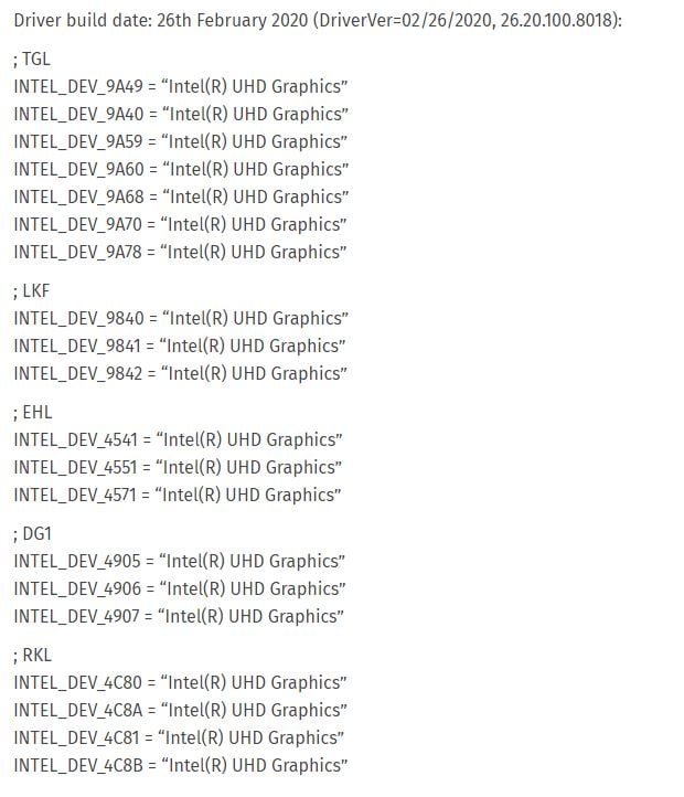 Bu güncelleştirmeye dahil olan sürücü, yalnızca resmi olarak Lakefield işlemcileri destekliyor. Öte yandan tüm bu CPU türlerinin aynı nesil grafikleri, yani Gen12’yi kullanması bekleniyor. INF dosyalarına bakarken, her nesil için bir dizi donanım kimliği listelendiğini görüyoruz. Her bir varyasyon için verilen ad ne yazık ki bize işlemciler hakkında bir bilgi vermiyor.