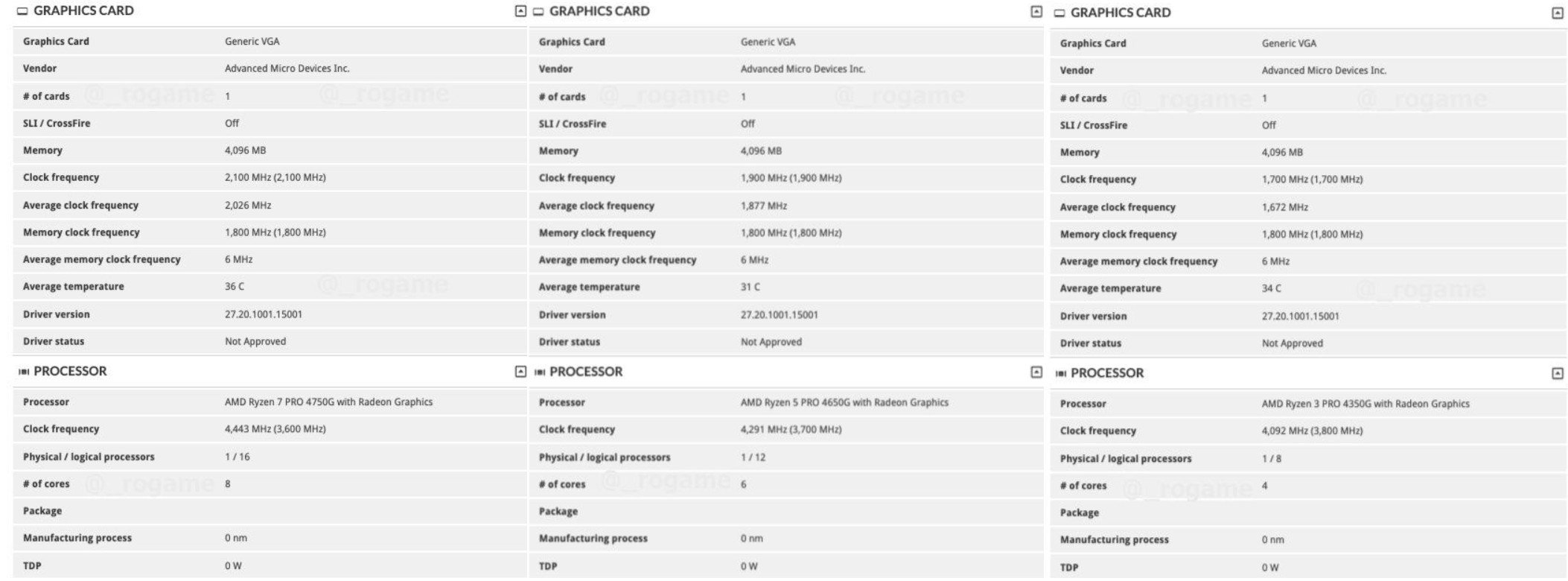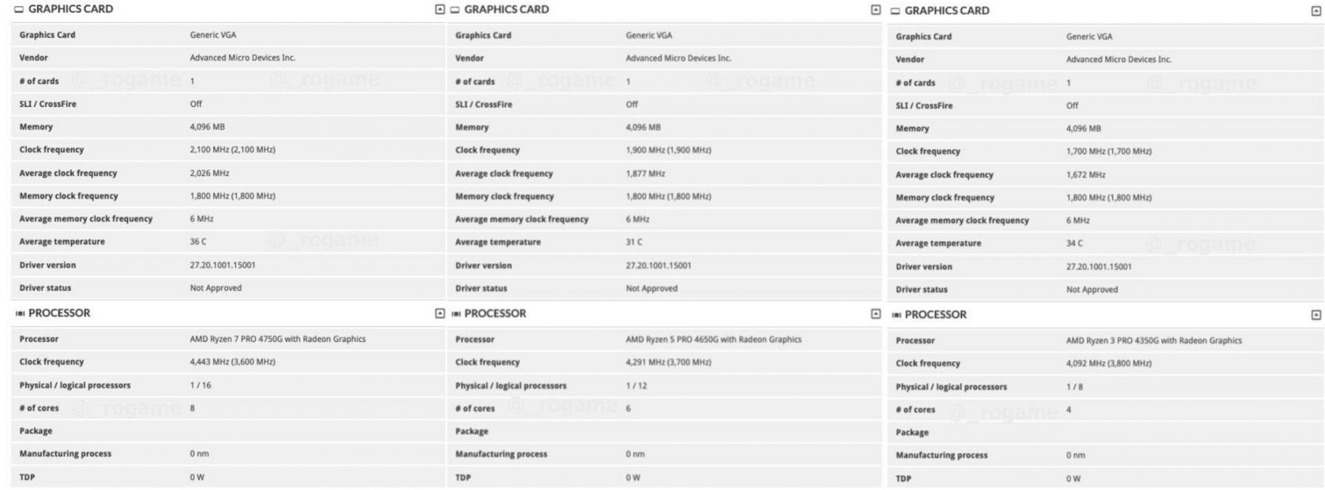 Ryzen 5 Pro 4650G ve Ryzen 3 Pro 4350G ise ilk bakışta 4400G ve 4350G’nin bir kopyası gibi görünüyor. Daha önce ortaya çıkmış olan işlemcilerin bilgileri ile de örtüşüyor.