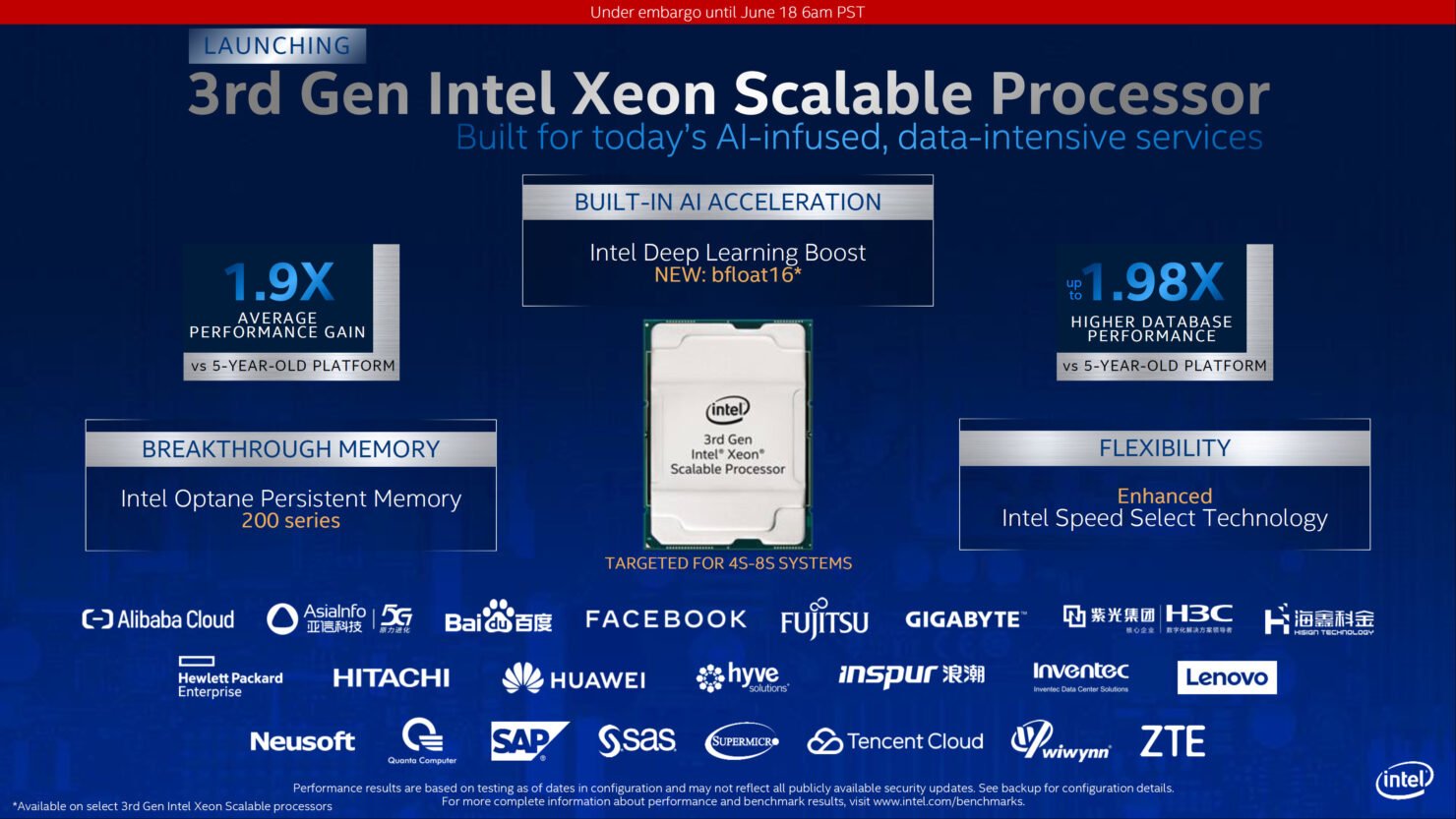 Intel, Cooper Lake-SP kod adına sahip üçüncü nesil Xeon Ölçeklenebilir (Gold ve Platinum) işlemcilerini duyurdu. Bununla birlikte Optane bellek teknolojisi ve Stratix AI FPGA ürünlerinin yeni nesillerini de piyasaya sundu.