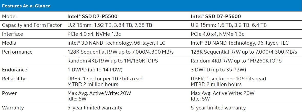 Intel, 96 katmanlı TLC NAND flaş kullanan SSD D7-P5500 ve SSD D7-P5600 serilerini de tanıttı. Depolama aygıtları U.2 15mm form faktöründe 7.68 TB, 3.84 TB ve 1.92 TB kapasitelerle geliyor.