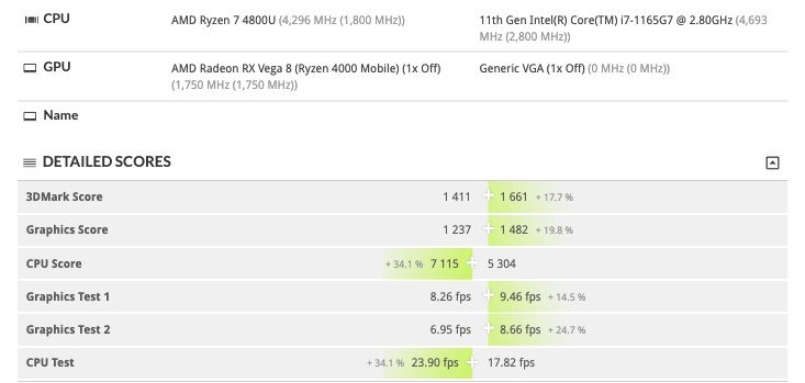 Rakamlara bakıldığında Intel Core i7-1165G7, CPU karşılaştırmasında Ryzen 7 4700U’nun 5302 puanıyla hemen hemen eşit olan 5304 puanı almayı başarıyor.  Tiger Lake çipi, grafiklerde rakibini neredeyse %35‘lik bir skor farkıyla alt ediyor. Ryzen 7 4800U ile karşılaştırıldığında ise Intel yonganın halen %20‘ye kadar önde olduğu görünüyor. Ancak işler CPU skoruna geldiğinde, 4800U’nun iş parçacığı sayısının 16’ya çıkması %34’lük bir fark yaratıyor.