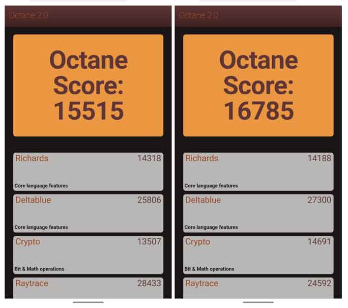 Örnek bir test sonucu, 64 bit Chrome 85 Dev tarayıcıya karşı mevcut Chrome 83 32 bit Octane 2.0 karşılaştırmasını gösteriyor. 32 bit versiyonun Octane puanı 15.515 olurken, yeni 64 bit versiyon 16.785 puan elde etmeyi başarmış.