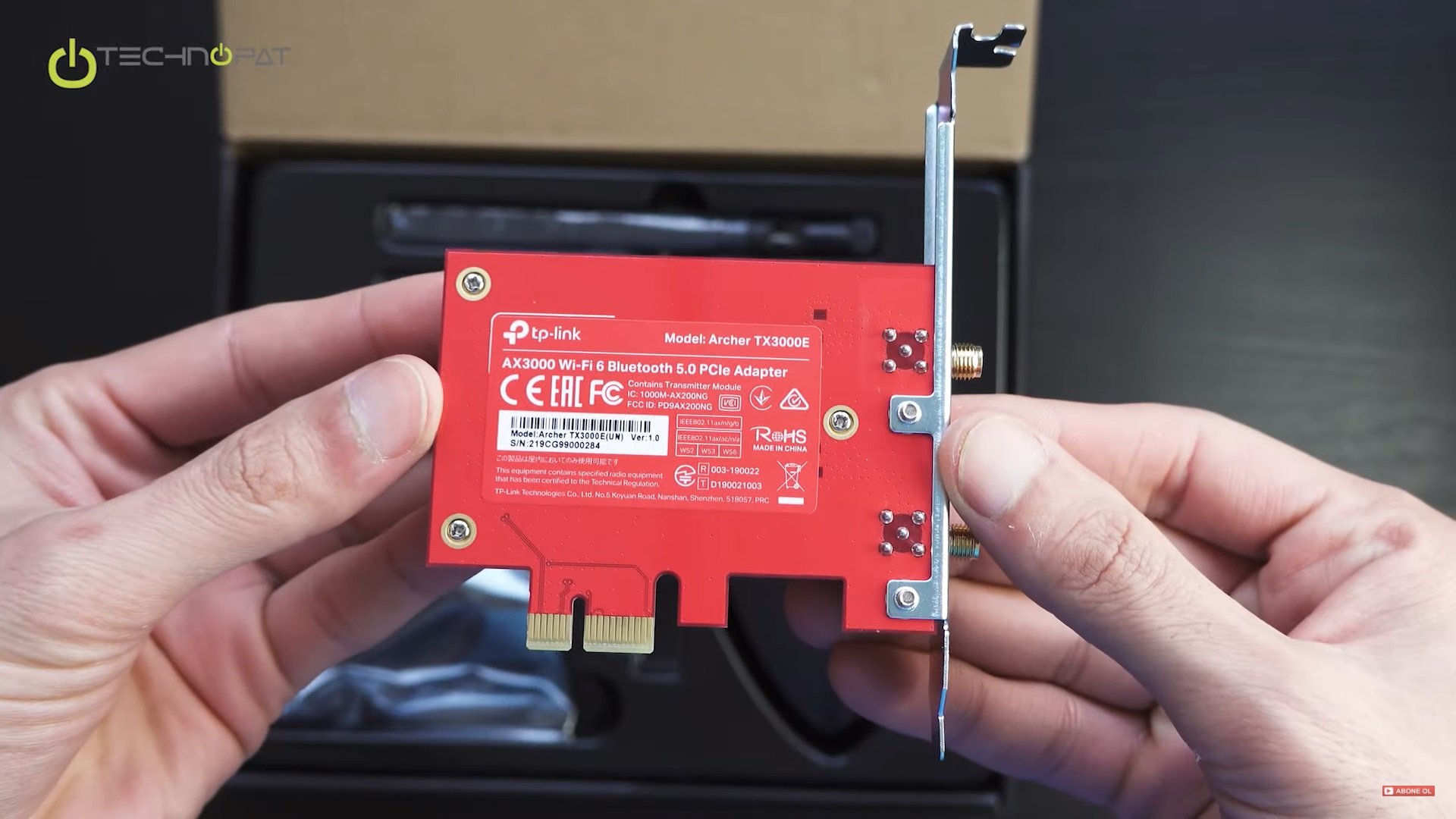 TX3000E ağ adaptörünün kendisi oldukça düşük profilli bir tasarıma sahip. Tek slotluk yer kaplıyor ve küçük boyutlara sahip. Üzerinde kırmızı renkli alüminyum pasif soğutması var. Kutudan bir de minik bir kablo çıkıyor. Bu kablo Bluetooth 5.0 özelliği için kullanılıyor. Kablonun bir ucunu adaptörün arkasına, diğer ucunu da anakart üzerindeki USB 2.0 bağlantı noktalarından birine takmanız gerekiyor.