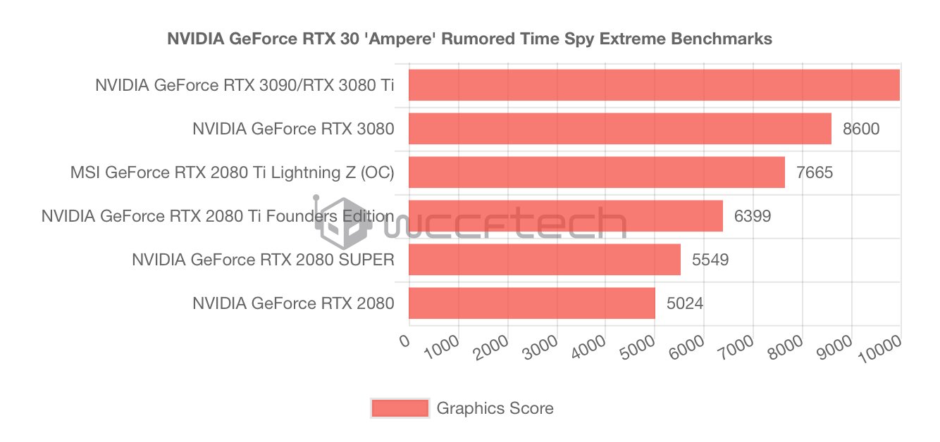 Söylentilere göre NVIDIA GeForce RTX 3080, 8.600 puanlık bir Time Spy Extreme grafik skoruna sahip. Aynı sızıntı, yine aynı testlerde RTX 3090/3080 Ti modelinin yaklaşık 10.000 puan elde ettiğini gösteriyor.