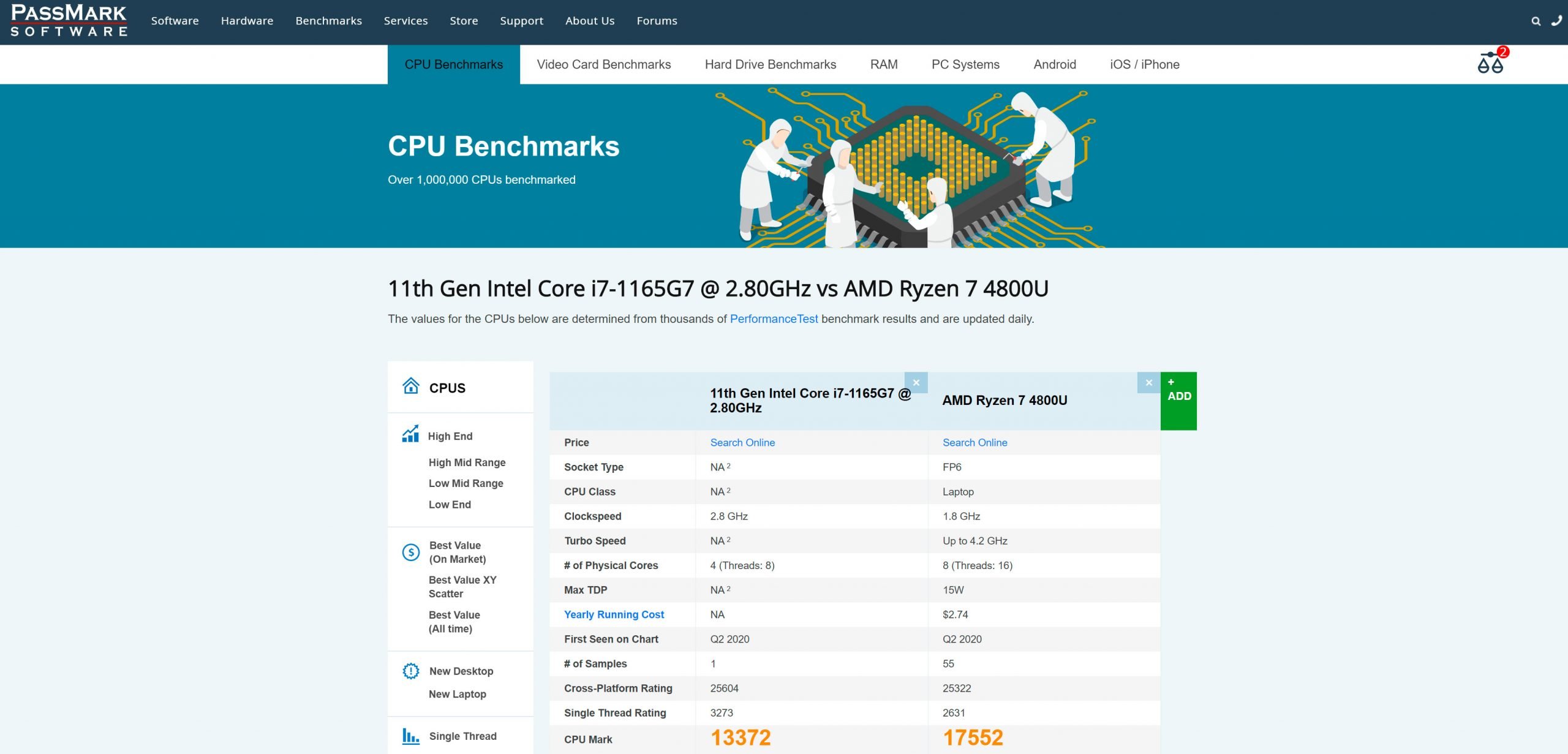PassMark, nihai puana ulaşmak için yazılımın test girdilerindeki tüm sonuçların ortalamasını alıyor. Ryzen 7 4800U bir süredir piyasada ve birçok PassMark testine sahip. Ancak Core i7-1165G7 için sadece bir örnek var ve bu yüzden hata payı olma ihtimalini belirtelim.