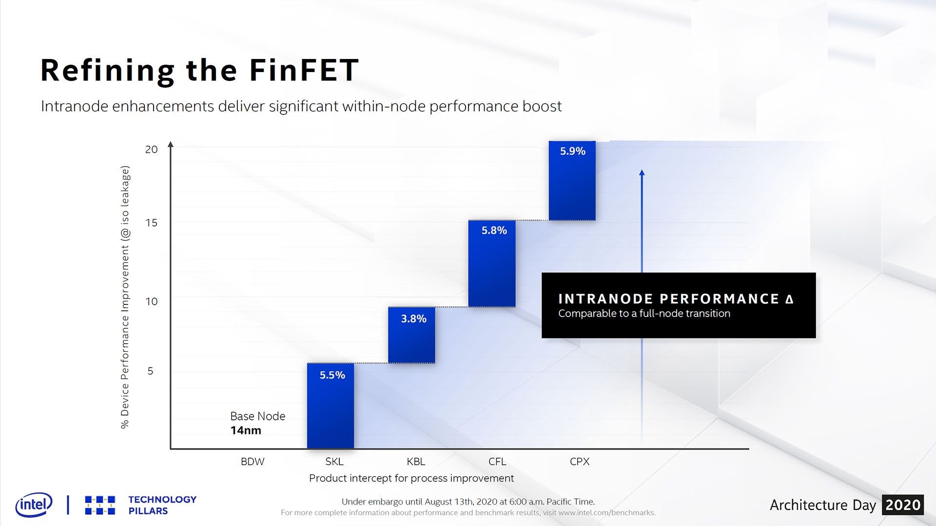 10nm SuperFin teknolojisi şirketin atmış olduğu birkaç adımla birlikte geliştirildi. SuperFin daha yüksek kapı aralığı, daha yüksek sürücü akımı, iyileştirilmiş kanal hareketliliği, daha düşük direnç ve yüksek gerilim sağlayan bir transistör teknolojisi niteliğinde. 10nm SuperFin transistörleri, ara bağlantı direncini %30 azaltan yeni bir ince bariyere sahip ve bu ara bağlantılar performansa olumlu etkide bulunuyor. Ayrıca bu bağlantılar transistörlerde küçülme ve yonga ölçeklendirmesinin önündeki engellerden biri ve bu süreçte kritik bir yol oynuyor.