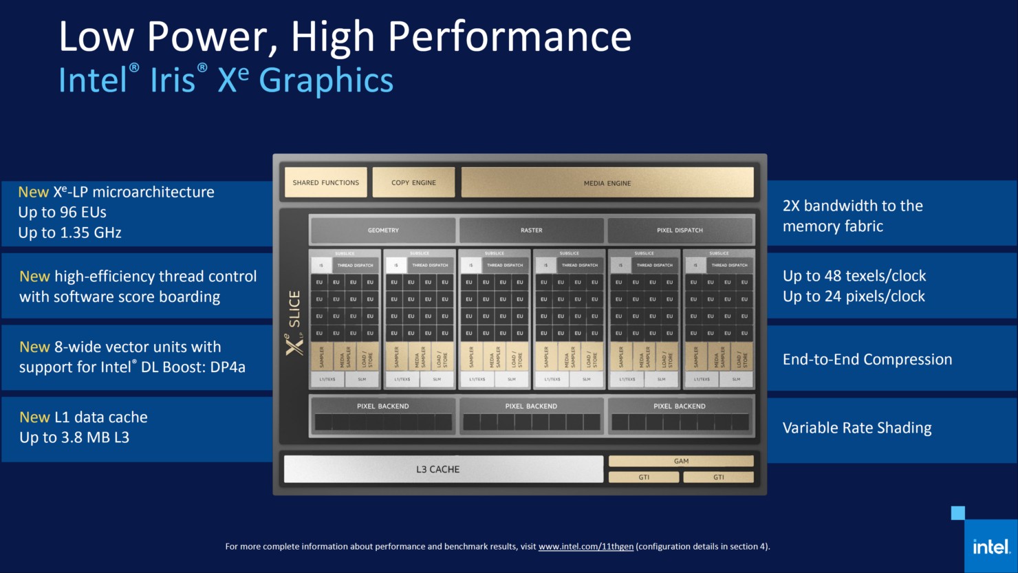 Yeni nesil Xe GPU’larını Tiger Lake yongalarda kullanılmaya başladı. Böylece şu anda Ice Lake yongalarında bulunan Gen 11 GPU’ya göre 2 kat daha fazla performans sağlanıyor. Intel Xe grafik mimarisi, 3.8 MB’a kadar L3 önbelleğin yanı sıra 96 Yürütme Birimine eşdeğer olan 768 çekirdek içeriyor. Ayrıca bu çekirdekler 1.35 GHz saat hızlarına erişebiliyor.