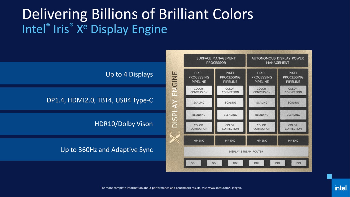GPU’nun yanı sıra bellek tarafında bant genişliği 2 kat artırılmış durumda. 4 adet ekran bağlanabilirken DisplayPort 1.4, HDMI 2.0, Thunderbolt 4 ve USB 4.0 Type-C bağlantıları destekleniyor. Öte yandan HDR10 ve Dolby Vision desteği de dahil edilmiş. Intel Iris Xe GPU’lu bilgisayarlara 360 Hz’e kadar monitör bağlamak mümkün ve Adaptive Sync teknolojisine destek sağlanıyor.
