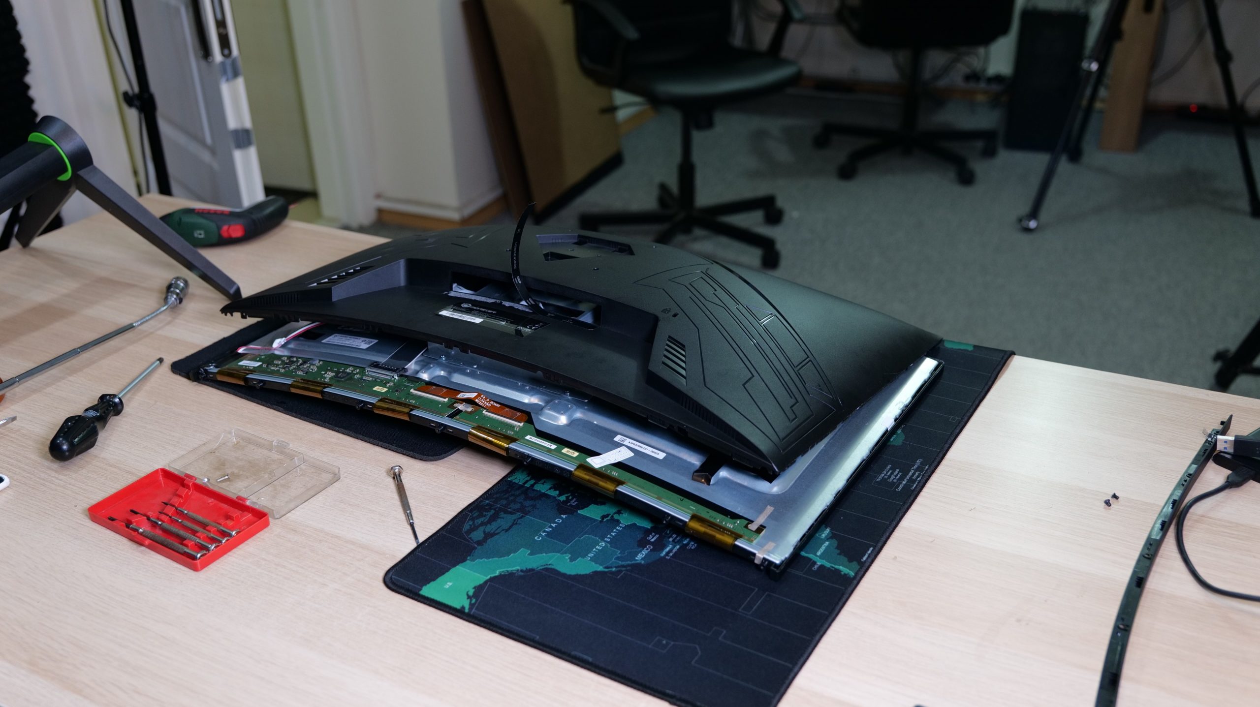 Monitörünüzün içini kendinizin açmanızı pek tavsiye etmiyoruz. Zira hassas bileşenlere zarar verebilir ya da kozmetik hasara yol açabilirsiniz. Biz açarken iki vida yuvasının HDMI – DP yazılı kısmın altına gizlendiğini sonlara doğru direnç ile karşılaşınca keşfettik.
