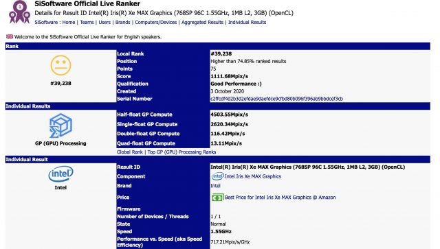 Veriler SiSoftware veri tabanından gelirken GPU’nun 96 Yürütme Birimi (Execution Unit) ve 768 işlemciye sahip olduğu görülüyor. Testte ayrıca 1.55 GHz saat hızı, 1 MB L2 önbellek ve 3 GB VRAM göze çarpıyor.