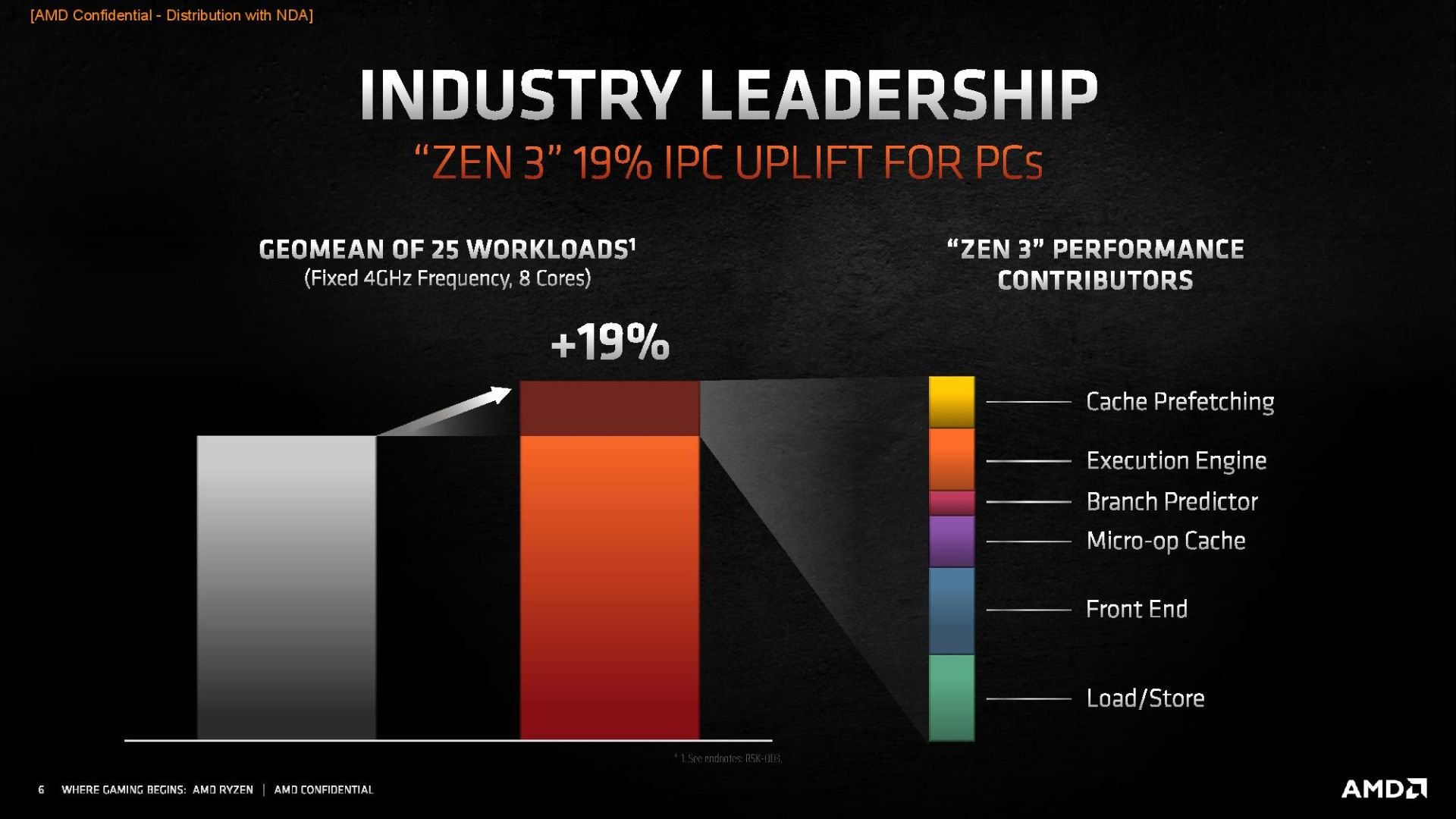 Yeni Zen 3 çekirdekleri, ortalama %19’luk IPC (döngü başına talimat) artışıyla birlikte geliyor. Öte yandan yeni işlemcilerde optimize edilmiş bir 7nm üretimi kullanılmış ve böylece 4.9 GHz’lik frekans hızlarını görebileceğiz. Şirket, 4.0 GHz’de kilitlenmiş iki sekiz çekirdekli yonga ile ölçülen 25 iş yükünün geometrik ortalamasını hesaplayarak %19’luk IPC kazanç değerine ulaştı.