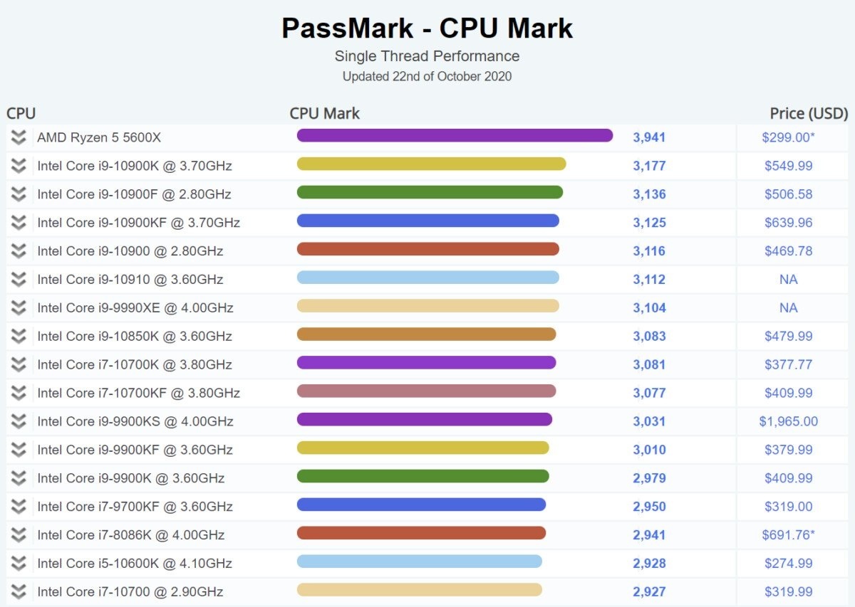 Testler PassMark üzerinde yapılmış ve kıyaslama amacıyla listede onlarca farklı CPU da var. Tek çekirdekli testlerde inanılmaz şekilde 3495 puan elde eden Ryzen 5 5600X, 3177 puan alan amiral gemisi Core i9-10900K’nın bile üzerinde kalıyor. Diğer işlemciler ise aşağı doğru sıralanmaya devam ediyor.