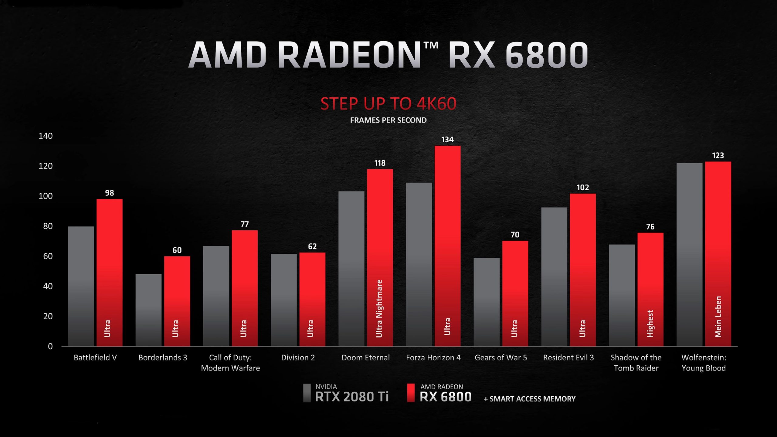 Aşağıda RX 6800 XT ekran kartının 4K çözünürlükte farklı oyunlarda sunduğu FPS değerlerini görebilirsiniz. AMD, kartı doğrudan RTX 3080 ile karşılaştırıyor ve 320W TDP değerine gçre 300W ile daha avantajlı olduğunu iddia ediyor. Öte yandan AMD GPU’nun içerisinde Tensor çekirdekleri olmadığını hatırlatmakta fayda var. Yine testlerde Ray Tracing olmadığını da göz önünde bulunurun.