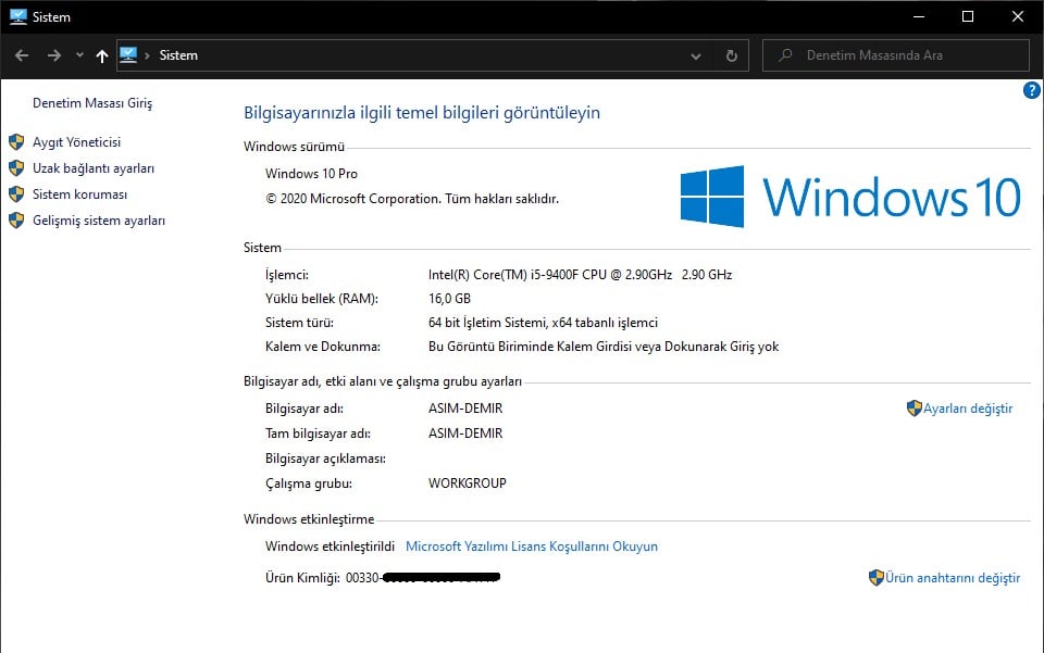 bilgisayara sağ tıklayıp özellikler deyince aynı ekran çıkıyor
