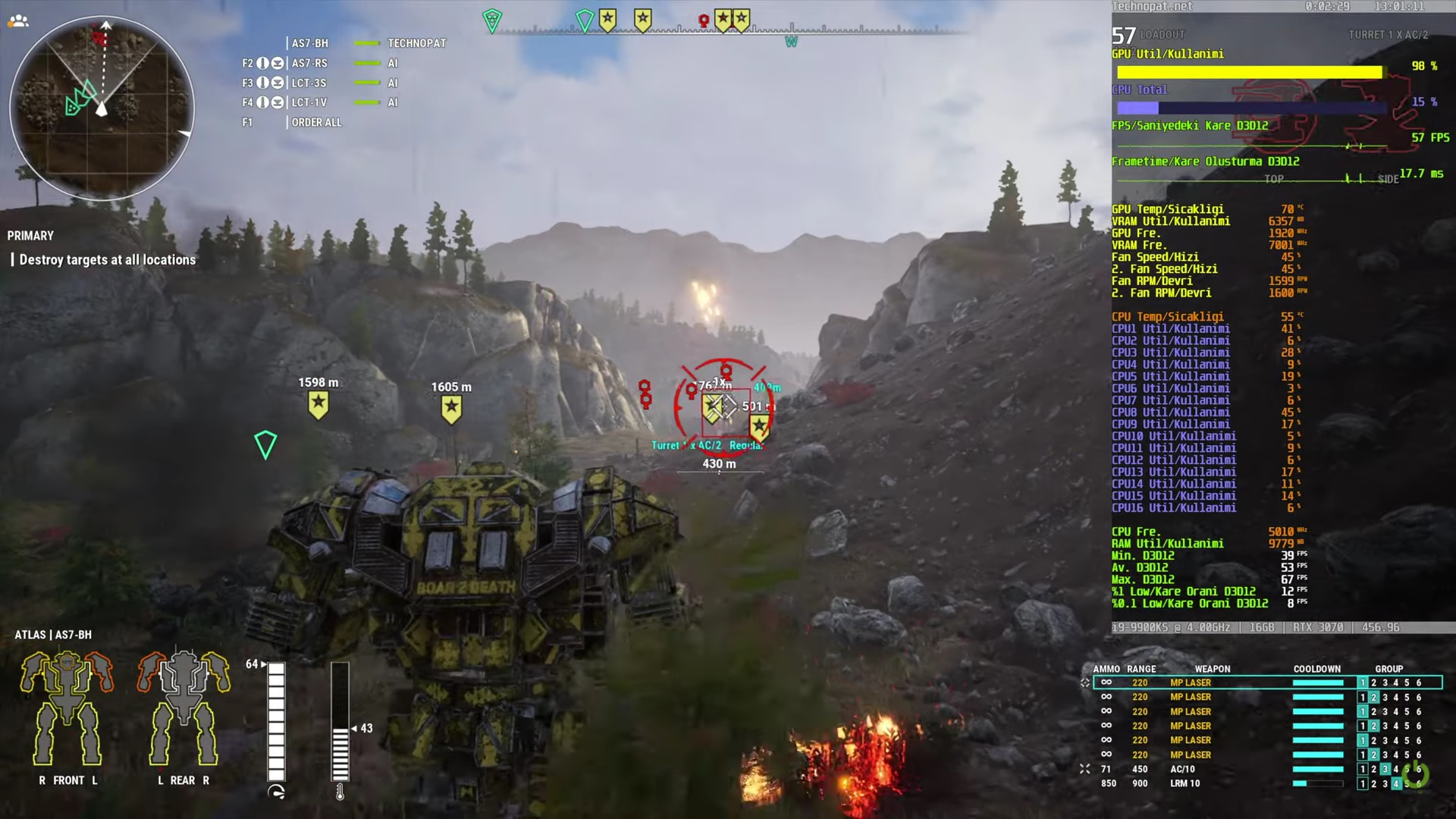 | 15- Mechwarrior 5 Mercenaries | 1440p Maximum Ray Tracing On DLSS Off | Min. 39 Ort. 53 Maks. 67 %1 13 %0.1 8 | 71 | 54 |
