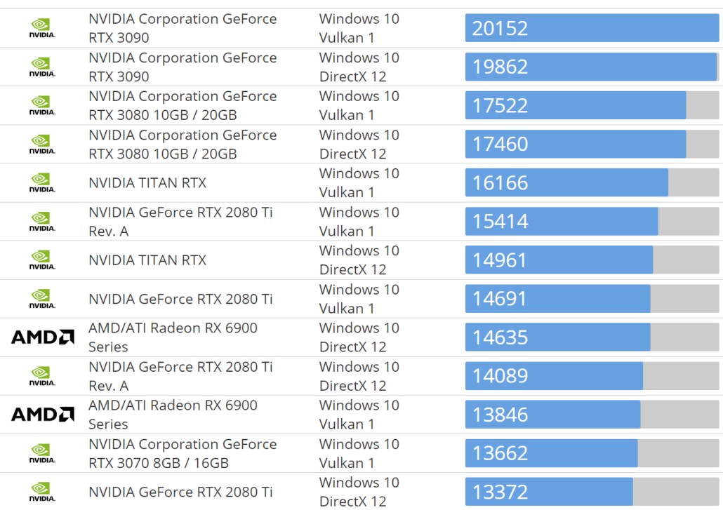 Performans sonuçlarına gelirsek, yeni GPU DX 12 API’de 14.635 ve Vulkan API’de 13.846 puana ulaşmış. GeForce RTX 3070’e baktığımızda Vulkan API’de 13.662 puan ve DX12 API ile 13.368 puan alıyor. Eski amiral gemisi GeForce RTX 2080 Ti ise DirectX 12 API ile 14.089 puan ve Vulkan API ile 14.691 puan elde etmiş görünüyor.