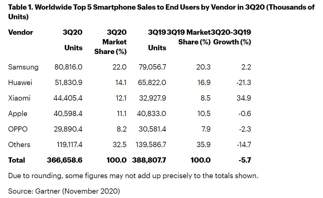 Rapora göre Apple’ın pazar payı %11.1 olarak açıklandı ve şirket bu yılın üçüncü çeyreğinde 40.5 milyon iPhone sattı. Ayrıca Xiaomi’nin 2020’nin üçüncü çeyreğinde 44.4 milyon akıllı telefon satarak üçüncü sırada yer alması herkesi şaşırtan bir durum oldu. Çinli firmanın pazar payı, geçen yıla göre %34.9 büyüme ile %12.1 oldu. Bu rakam 2019’un üçüncü çeyreğinde %8.5’ti. OPPO ise, 29,8 milyon adetlik satış ve %8.2’lik pazar payı ile küresel akıllı telefon pazarında beşinci sıraya yerleşti.