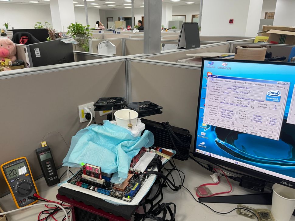 Çinli overclock meraklısı, eski Celeron işlemciyle birlikte Intel X38 yonga setine dayalı ASUS P5E64 Professional anakart kullandı. Bununla birlikte hız aşırtma işleminde artık geleneksel hale gelen sıvı nitrojen kullanıldı. Denemeler sonucunda ise 8362 MHz frekans hızları görüldü.