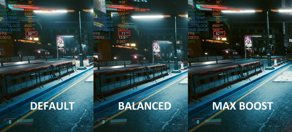 Geliştirici, bir GeForce GTX 1070 Ti ile oyunun varsayılan ayarlarıyla 42 FPS’den 51 FPS’ye uzanan kare hızları kaydetmiş. Dengeli modda, kare hızları büyük ölçüde iyileştiriliyor ve 54 ile 71 FPS arasında değişiyor. Max Boost modu kare hızlarını yaklaşık 51 ila 80 FPS‘ye yükseltiyor. Hatta gündüz sahnelerinde kare hızları 88 FPS‘ye kadar çıkıyor.