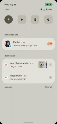 İddia edilen Android 12 ekran görüntülerinden biri, yeni bir bildirim paneli kullanıcı arayüzünü sergiliyor. Şeffaflık ortadan kalkıyor ve yerini opak açık bej bir arka plan alıyor, ancak renk muhtemelen mevcut temaya ve/veya Koyu Modun etkin olup olmadığına bağlı. Geri kalan bildirimlerle “konuşmalar” bölümü arasındaki ayrım hala orada ve her bildirimin yuvarlatılmış köşeleri artık daha belirgin. Bildirim paneli kısmen genişletildiğinde gösterilen Hızlı Ayarlar döşemelerinin sayısı 6’dan 4’e düşürülmüş ve her bir simgenin daha büyük olmasına neden olmuş. Tarih ve saatin konumları değiştirilirken, sağ üst köşede yeni gizlilik göstergeleri de var.