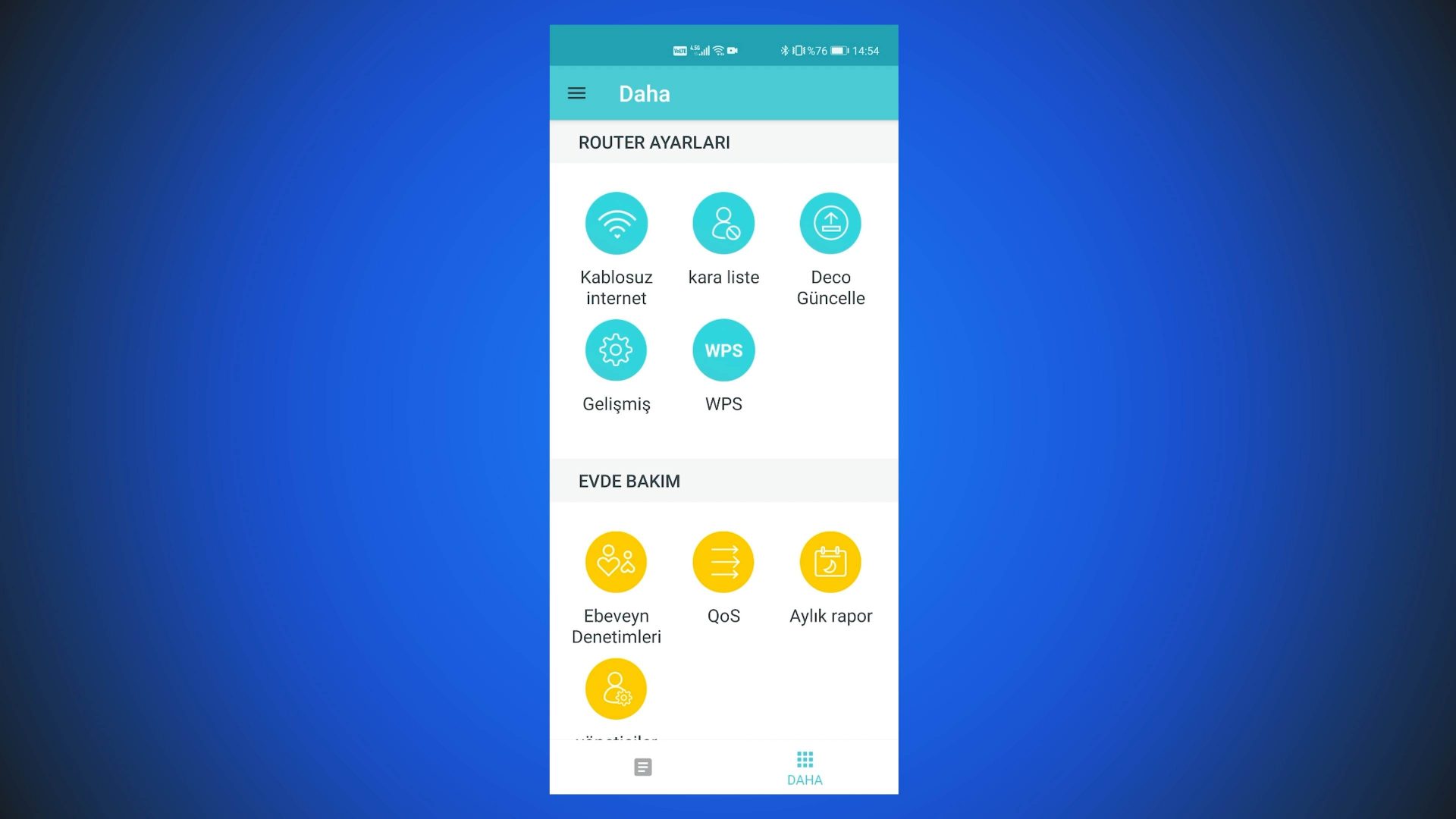 Uygulama 2 ana kategoriden oluşuyor. “Genel bakış” ve “Daha”. Genel bakışta ağınıza bağlı istemcilerin bir listesini ve anlık ne kadar indirme ve gönderme yaptıklarını görebiliyorsunuz. “Daha” kısmında yapabileceğiniz birçok şey var. Örneğin wi-fi ağınızı yönetebiliyorsunuz ve cihazın çalışma şeklini yönlendirici veya access point olarak değiştirebiliyorsunuz. Ebeveyn kontrolleri eklemeyi de ihmal etmemiş buraya Tp-Link. Seçtiğiniz istemcilere gün ve saat bazlı olarak erişim kısıtlaması getirebiliyor ve belirli kategorideki web sayfalarını engelleyebiliyorsunuz. Her Tp-link cihazda görmeye alıştığımız gibi cihaz üzerindeki LED buradan açılıp kapatılabiliyor.