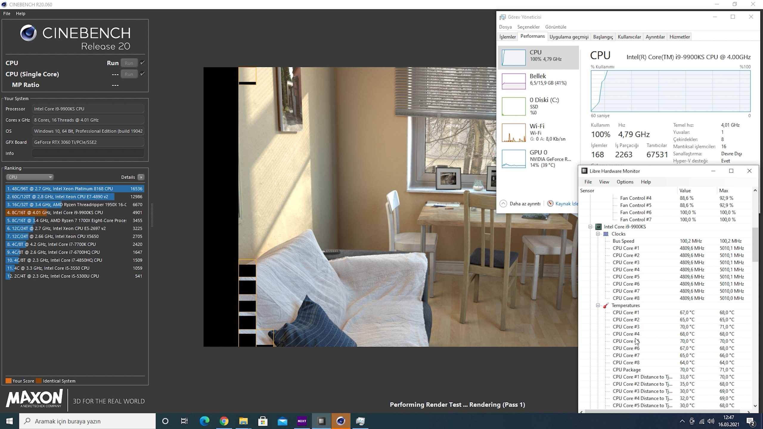 Performans testimizi 25 derece ortam sıcaklığında gerçekleştirdik. 127W TDP kilidini BIOS altından kaldırdığınızda oldukça yüksek güç çekip ısınmasıyla bilinen Intel 9900KS işlemcisini Cinebench R20 çoklu çekirdek render testine sokup, çekirdeklerin ulaştığı maksimum sıcaklığı Libre Hardware Monitör uygulamasıyla ölçtük.