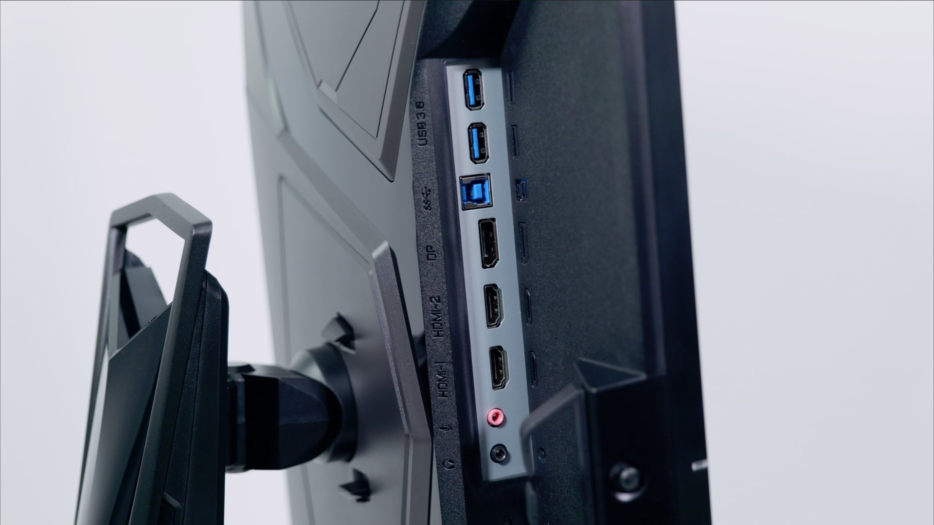 Gigabyte Aorus FI27Q-X monitörün portlarına baktık. Soldan sağa, Kensington kilit yuvası, 3.5 mm kulaklık ve mikrofon portları, 2 HDMI, 1 DisplayPort, 1 USB Type-B USB girişi ve 2 adet USB 3.0 Type-A çıkışı görüyoruz. Type-B kablo monitörü bilgisayarınıza bağlamak ve USB portlarını kullanıma açmak için var.