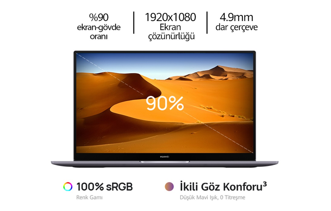 Huawei MateBook D16, yüzde 90 düzeyinde görüntülenebilir alan sunan bir IPS ekranla geliyor. 4.9mm ince çerçeve tasarımıyla da bulunduğu ortama uyum sağlayan dizüstü bilgisayar, düşük mavi ışık ve titreşim önleme özellikleriyle kullanıcılarının göz sağlığını korumayı hedefliyor.