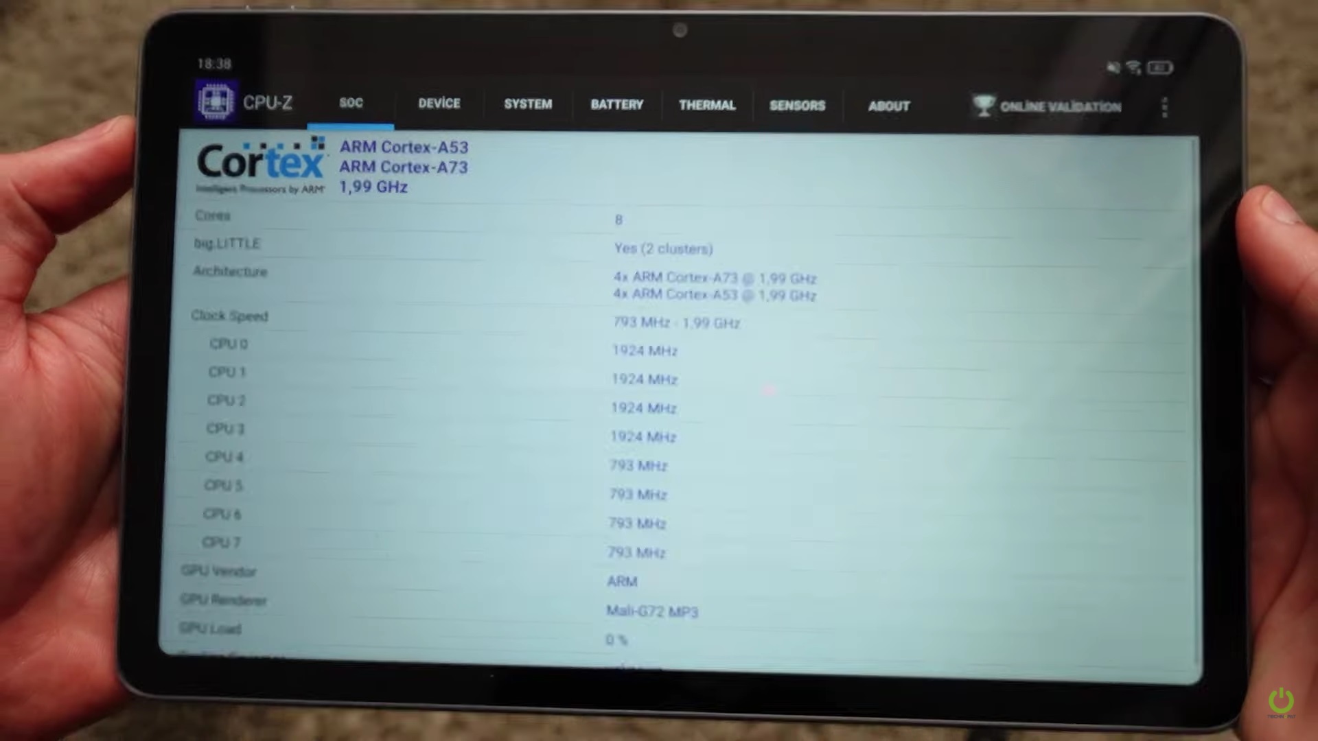 Bu tabletin güzel noktalarından biri de güncel bir giriş seviyesi işlemciye sahip olması. 8 çekirdekli bu işlemci 4 adet 2.0 Ghz’de çalışan Arm Cortex A73 performans çekirdeğine, 4 adet 2.0 Ghz’de çalışan Arm Cortex 53 güç tasarruflu çekirdeğe sahip. GPU olarak Mali-G72 MP3’ü görüyoruz.