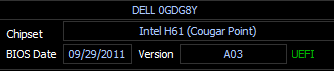HWiNFO64’de Anakart modelim Dell 0GDG8Y İntel Chipset:H61 Bios Date:29/09/2011 Version:A03