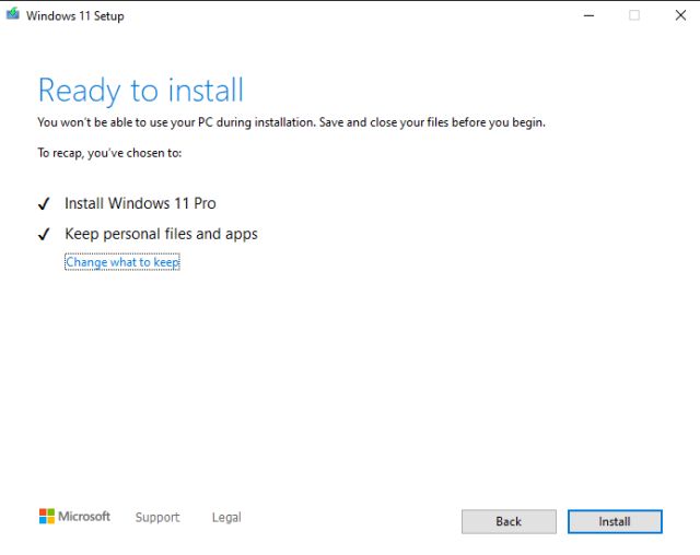 Windows 11 Lisans Koşulları Haziran 2021 - Kısa bir süre bekledikten sonra Windows 11 yüklenmeye hazır yazılı ekran açılacak. Burada Change what to keep diyerek kurulum başlamadan önce kendi tercihinize göre ayarları gözden geçirebilirsiniz.