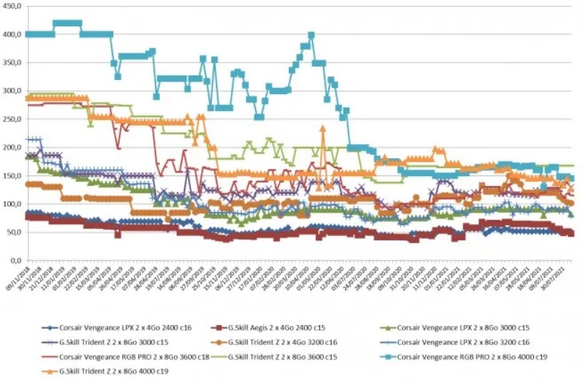 CowCotland, Trident Z ve Vengeance serileri de dahil olmak üzere çeşitli G.Skill ve Corsair ürünleri için fiyat çizelgelerini inceledi. G.Skill’in 2x8GB Trident Z ve 2x4GB Aegis gibi bazı kitlerin fiyatı sadece 1-3 euro aralığında düştü. Ancak G.Skill Trident Z 2×8 GB 3000 MHz, Corsair Vengeance LPX 2x8GB 3200 MHz ve G.Skill Trident Z 2×8 GB 4000 MHz gibi birçok model, genel olarak 15-20 euroya kadar büyük düşüşler gösterdi.