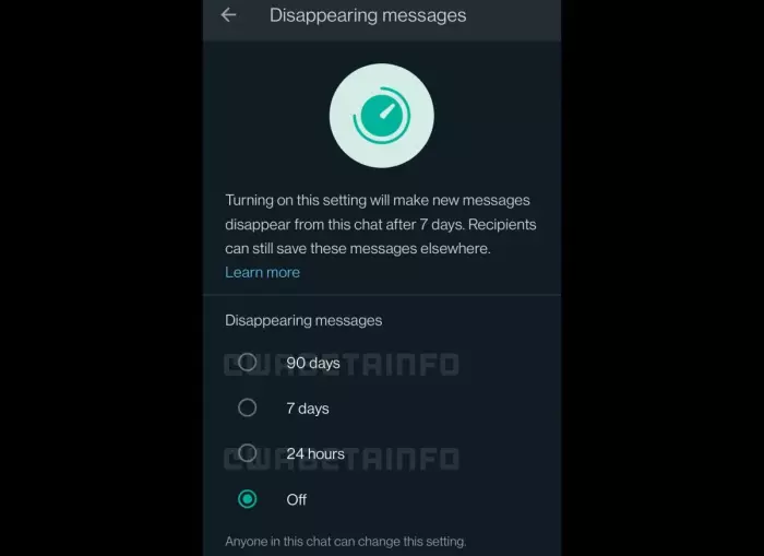 WaBetaInfo, kullanıcıların kaybolan mesajlarını özelleştirmelerine olanak tanıyan yeni bir menünün ekran görüntülerini de paylaştı. Bu menü; 90 gün, 7 gün, 24 saat arasında değişen seçenekler sunuyor veya özelliği tamamen kapatıyor.