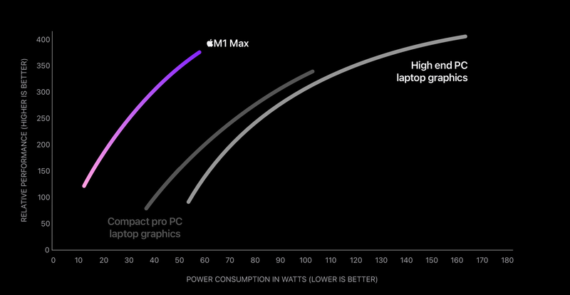 M1 Max, M1 yongasında sunulan 8 çekirdekli GPU seçeneğine kıyasla devasa bir sıçrama olan 32 çekirdeğe kadar GPU içerecek şekilde yapılandırılabiliyor. Apple, M1 Max yongasının en yüksek grafik performansında harici ekran kartına sahip bir dizüstü bilgisayara göre yüzde 70 daha az güç kullandığını söylüyor. Apple ayrıca, M1 Max yongasının 100 watt daha az güç kullanırken “yüksek performanslı ayrı GPU’lu profesyonel dizüstü bilgisayar” ile “benzer performans” sunduğunu iddia etmişti.