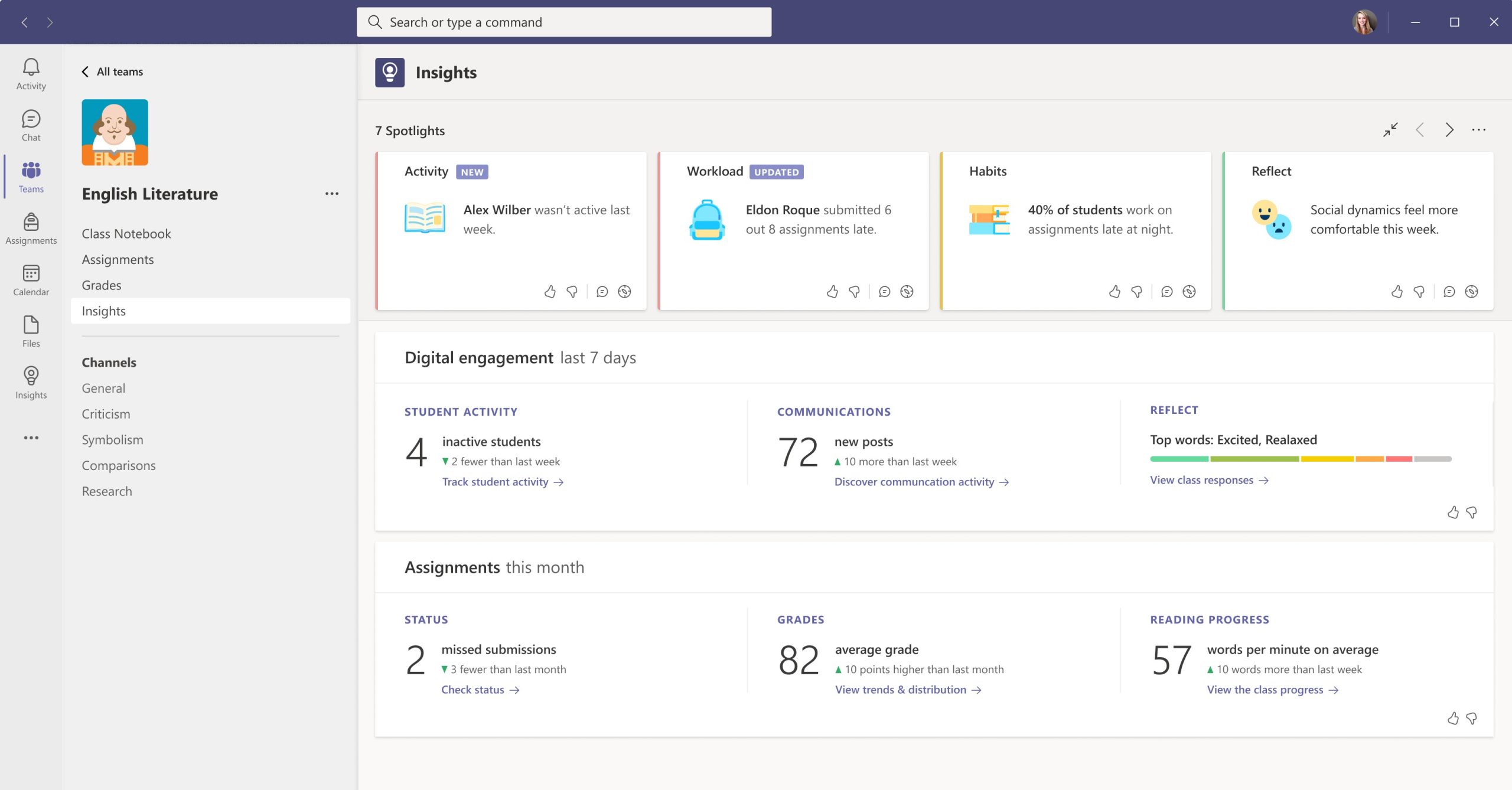 Education Insights, öğretmenlerin zamanlarını ihtiyaçların en fazla olduğu yerlere odaklamalarına ve öğrencilerin nasıl performans gösterdiğine dair daha bütünsel bir görüş elde etmelerine yardımcı olmak için eğitimcilere öğrenci katılımı, ödev performansı ve duygusal esenlik hakkında gerçek zamanlı analizler sağlayan bir uygulama. Tam Ekran Okuyucu, okuma güçlüğü çeken tüm öğrenciler için dijital içeriğin okunmasını ve anlaşılmasını kolaylaştırmak için Microsoft 365’te yerleşik olarak bulunuyor. İkinci dil öğrenenlerin sınıfa tam olarak katılabilmeleri için gerçek zamanlı çeviri ve yan yana not alma ile yardımcı olmak için Microsoft Translator, Microsoft Teams’e yerleştirilmiş durumda. Tüm bu özellikleri ve daha fazlasını ve ayrıca büyüyen bir ortak uygulamaları kataloğunu Microsoft Teams’de bir araya getirerek, günümüzün karma sınıfının kalbinde işbirliği için dinamik bir dijital merkez ve birleşik platform oluşturmak amaçlanıyor.