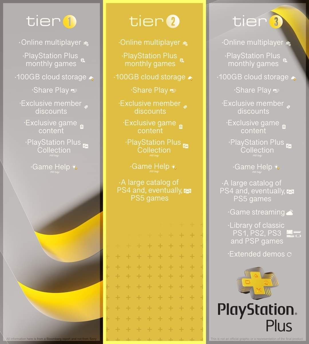 Bu noktada yeni bir görsel sızdırıldı ve PlayStation Plus platformunun üç ayrı katmana ayrılacağını görüyoruz. Abonelik katmanlarının tümünde çevrimiçi oyunculuk, aylık Plus oyunları, 100 GB bulut depolama, özel içerikler ve Share Play gibi özel ayrıcalıklar sunuluyor. İkinci katman, kütüphaneyi PlayStation 4 oyunlarına ve hatta bazı PlayStation 5 oyunlarına açacak. En yüksek fiyatlı katman ise yukarıdakilerin tümüne ek olarak demo, akış ve PlayStation geçmişinden bir oyun kitaplığı içeriyor; bu da PlayStation, PS2, PS3 ve PSP’den oyunlara erişim anlamına gelmekte.
