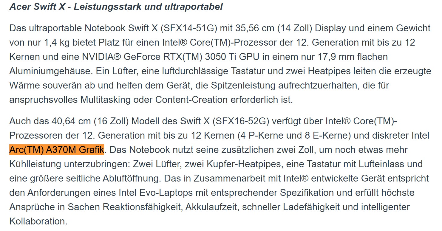 Öte yandan OEM ortaklarından biri bazı küçük detaylar sağladı. Görünüşe göre Acer Almanya, Swift X dizüstü bilgisayarının Arc A370M’ye kadar GPU’larla sunulacağını resmen doğruladı.