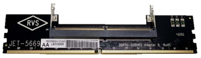 Standart DDR5 DIMM’lerde 288 pin bulunurken, SO-DIMM eşdeğerinde 262 pin bulunuyor. Bu nedenle uygun dönüştürme adaptörü olmadan RAM’leri kullanmak mümkün değil. JET-5669AA, satıcıların DDR5 SO-DIMM bellek modüllerini DIMM yuvalarında test etmeleri için üretilen bir cihaz.