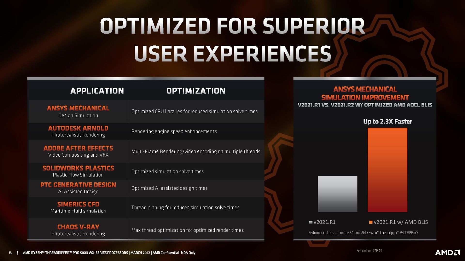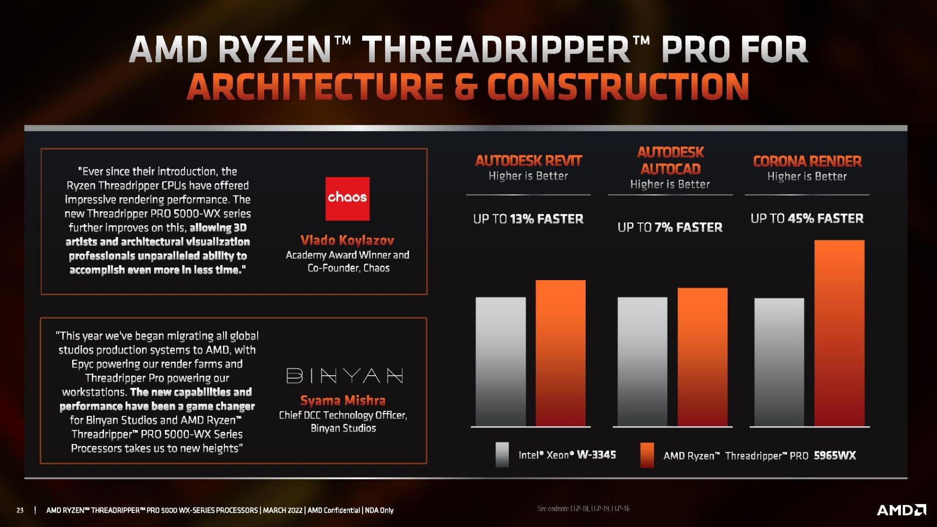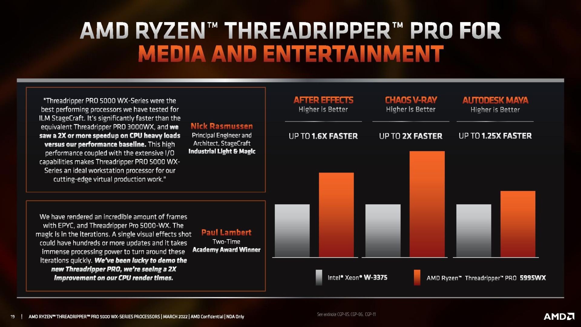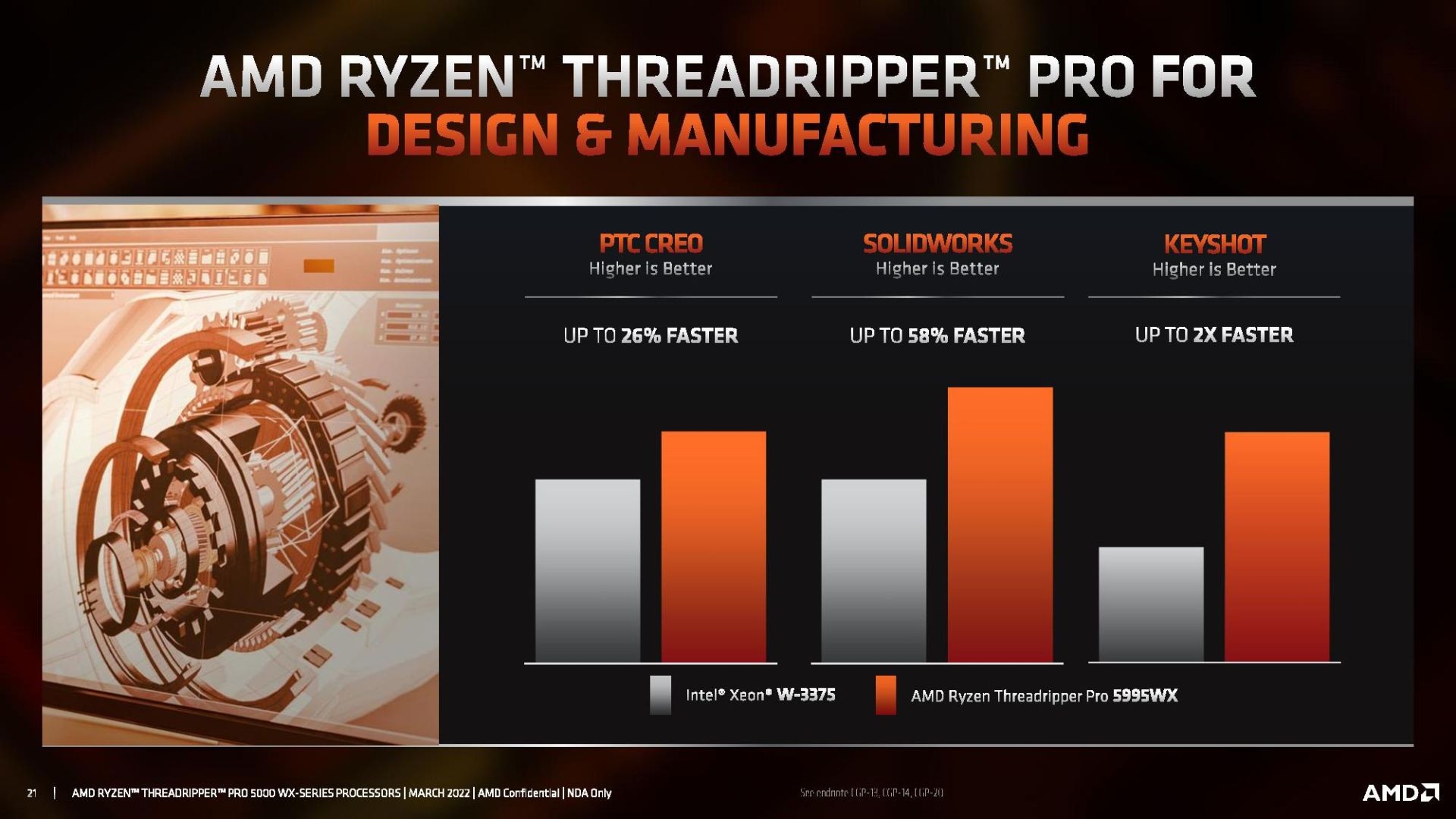 AMD, önceki nesil Threadripper Pro serisiyle 300 tasarım galibiyeti elde ettiğini ve bu sayının 5000 WX serisiyle artmasını beklediğini söylüyor. Bu sistemler, profesyonel pazarın petrol ve gaz uygulamaları, medya ve eğlence (DreamWorks gibi), tasarım ve üretim iş yükleri, yerel iş istasyonları için Threadripper Pro kullanan bulut bilişim müşterileri ve hatta 12 otomobil üreticisini içeren inanılmaz derecede çeşitli bölümleri hedefliyor.