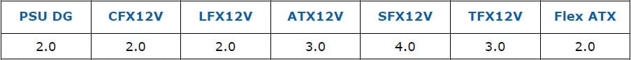 ATX12V v3.0, aşağıdaki tabloda gösterilen tüm form faktörlerinde revizyon değişiklikleri içeriyor.