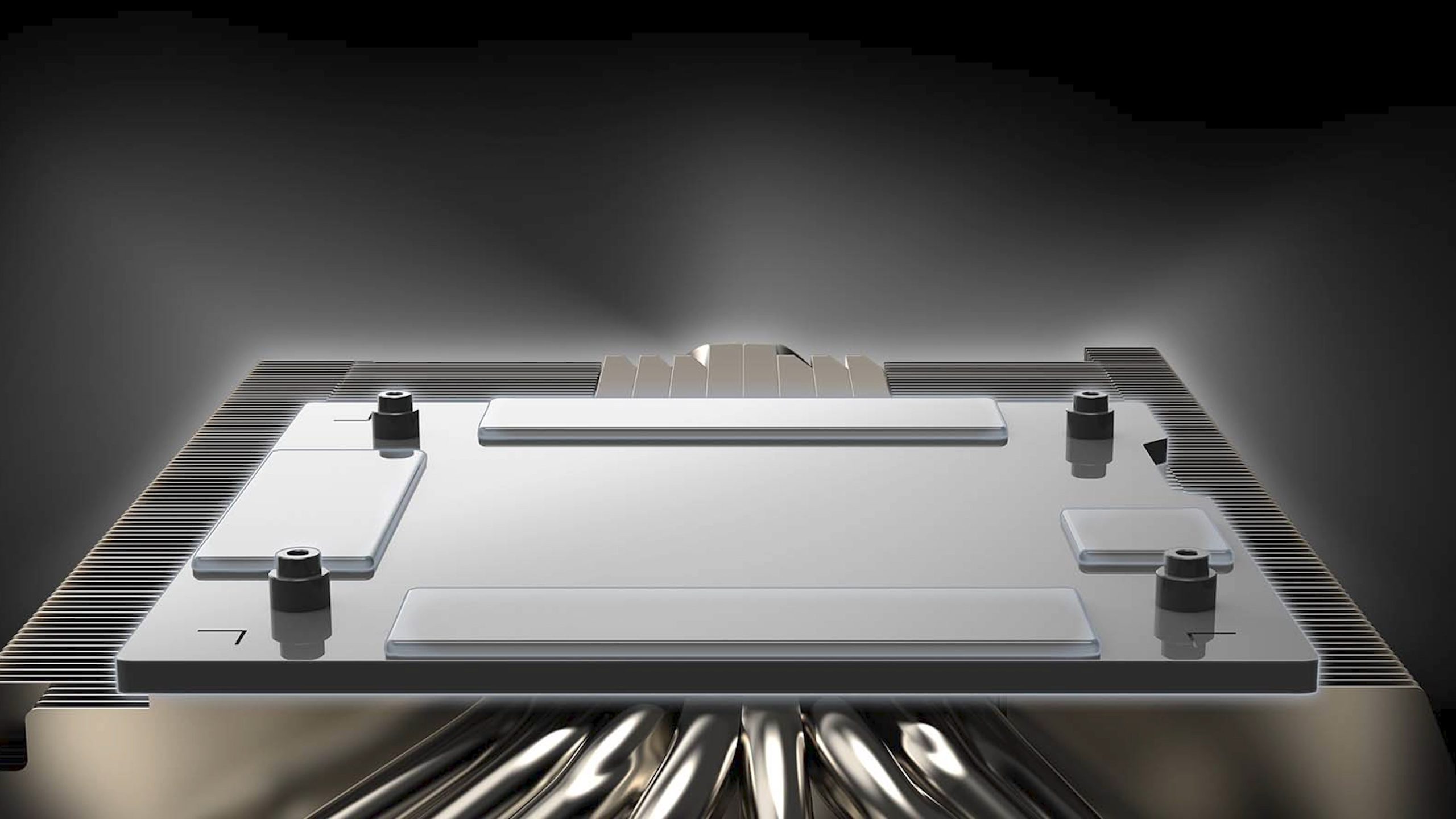 Soğutucunun bakır ısı boruları sadece çekirdeği değil, vrm, bellek ünitelerini de soğutuyor. Bir baseplate tüm bu parçalarla temas halinde ve o da ısı borularına bağlı.