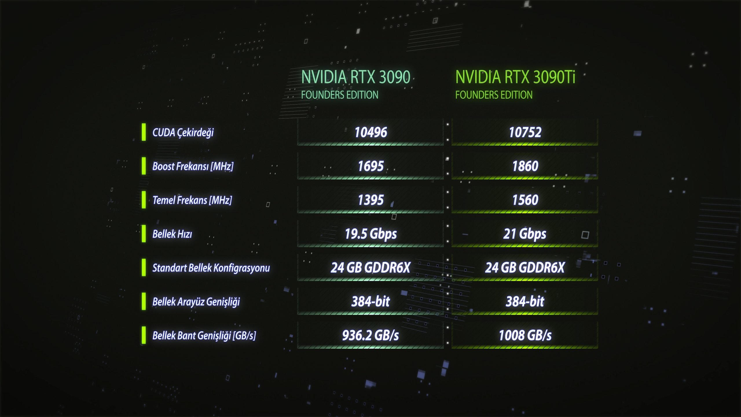 3090 Ti’ı piyasadaki son kullanıcıya hitap eden diğer ekran kartlarından ayıran bir diğer yanı da devasa 24GB belleği. Tabii ki bundan daha büyük belleğe sahip profesyonel ekran kartları da görüyoruz. Örneğin Nvidia 48GB bellekli RTX A6000 ekran kartı da çıkardı. Ancak bu kartta ECC desteği olabilmesi için eski nesil ve yavaş GDDR6 bellekler kullanılmıştı. 3090 Ti’da ise 21Gbps hızına ulaşan GDDR6X bellekler görüyoruz ki bu bellekle 1TB/s’nin üzerinde bir bellek bant genişliği elde ediyor kart.